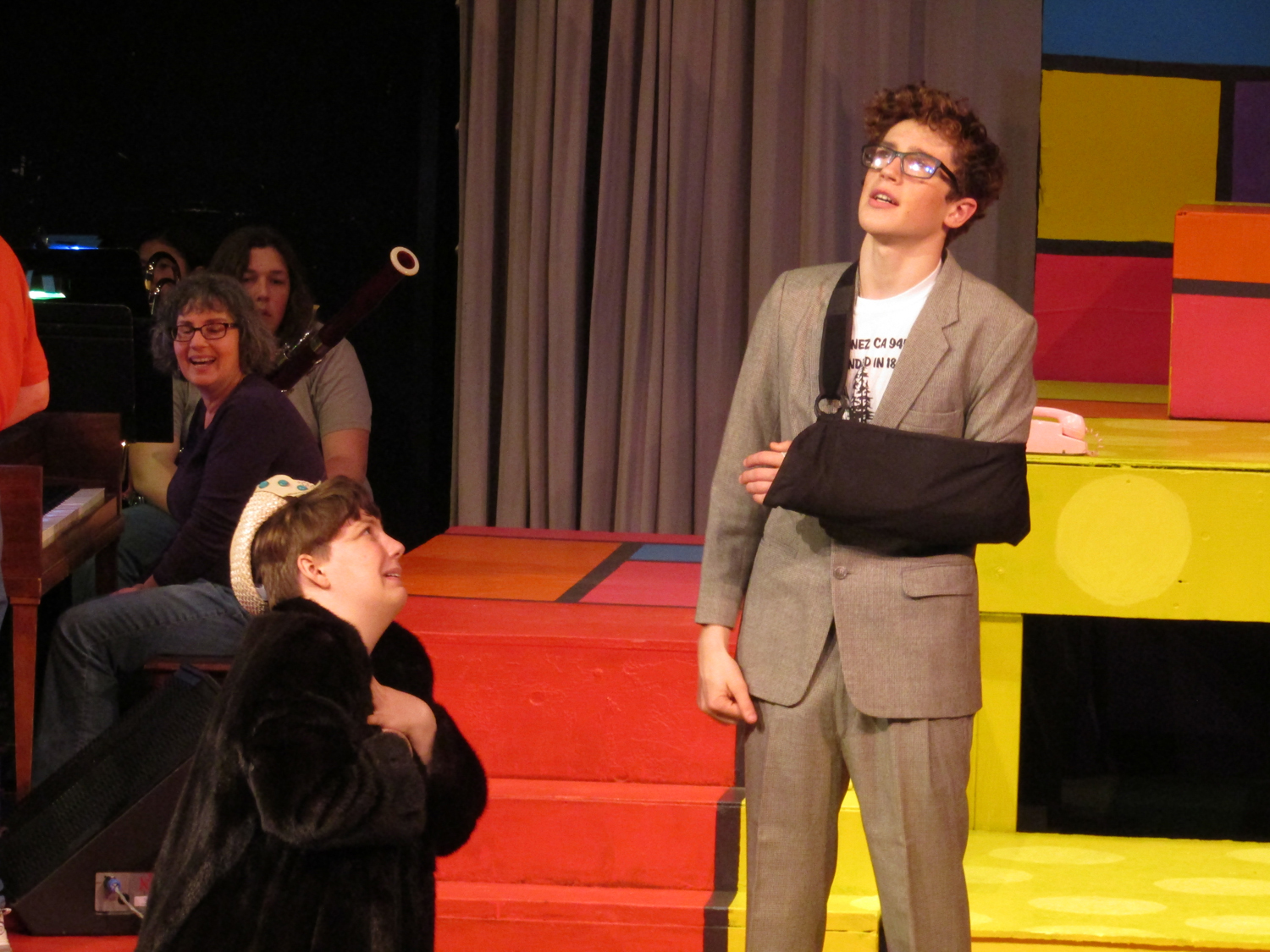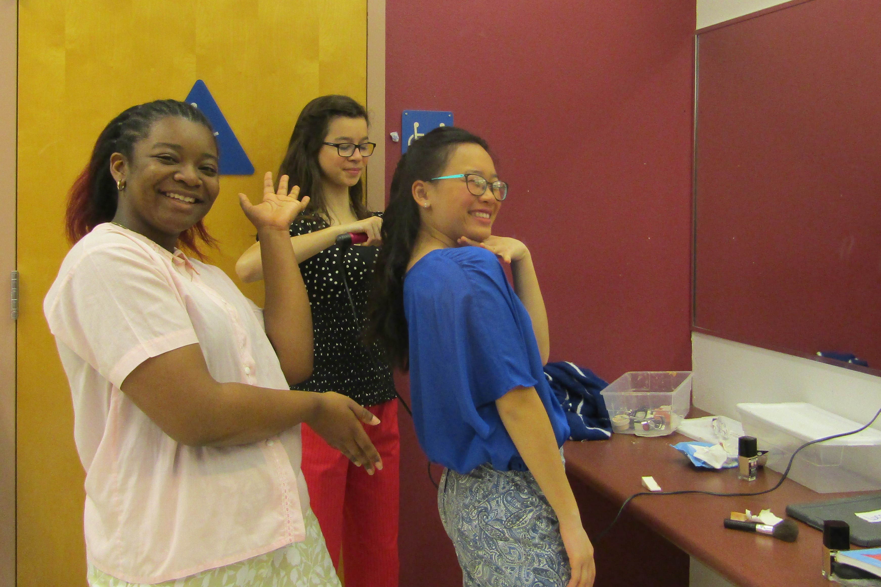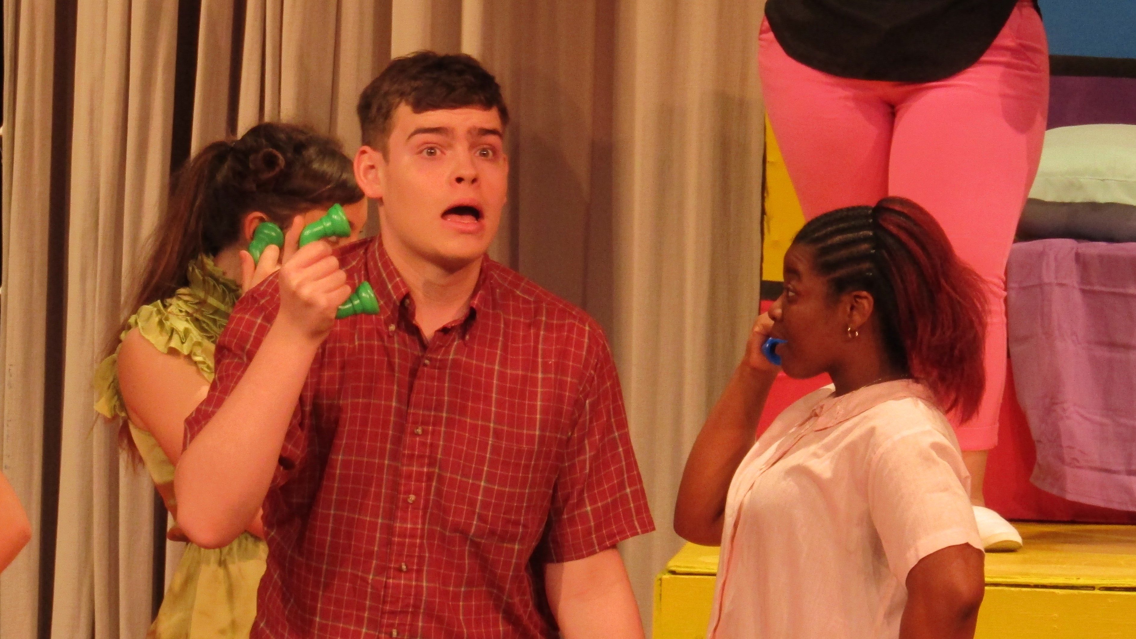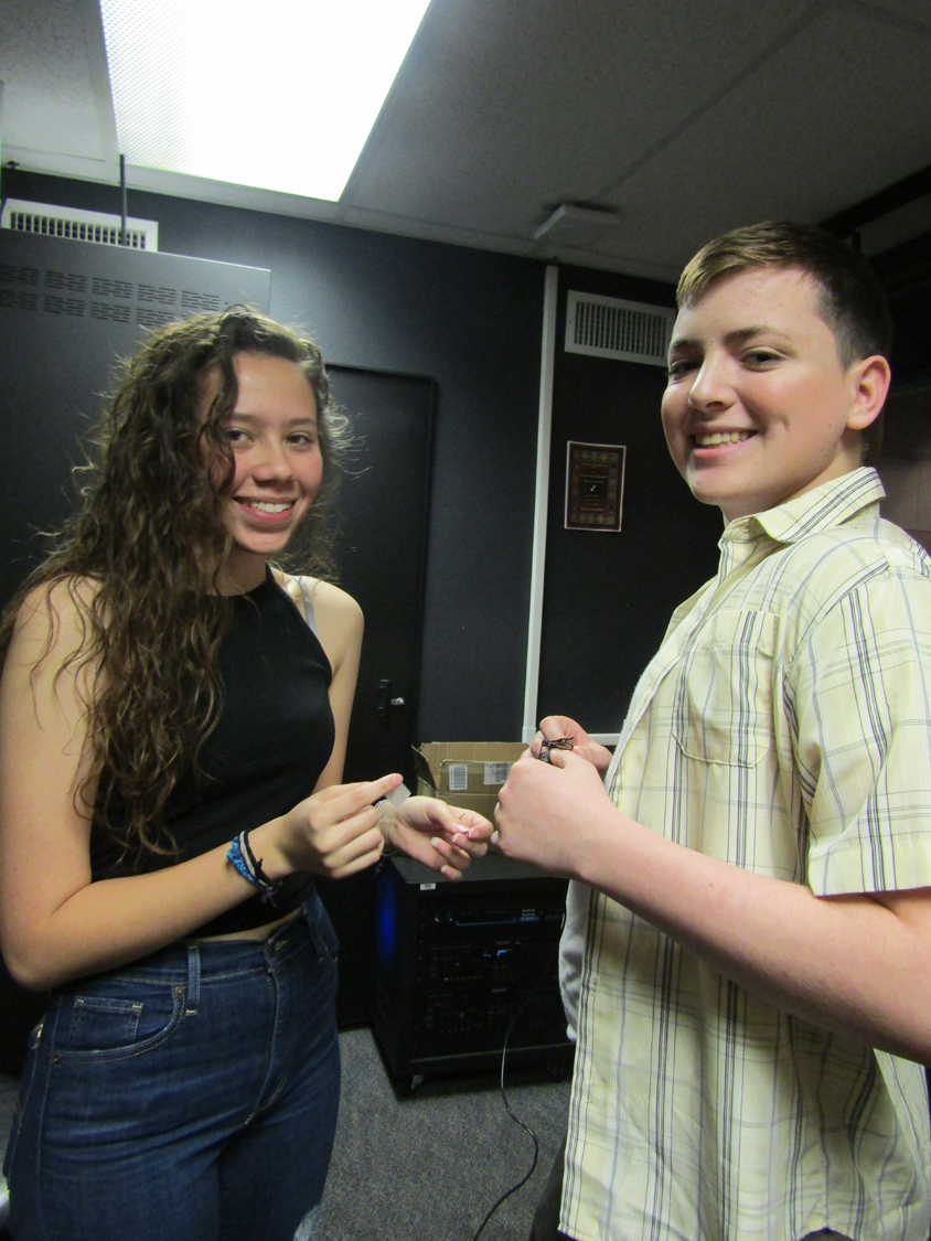 Amaya DeShasier, sound technician, agreed with Elam as she attached a mic to Jonah Leib who plays Randal, the kid brother. Ms. Sara Stafford, costume and tech Goddess, has taught her students well.