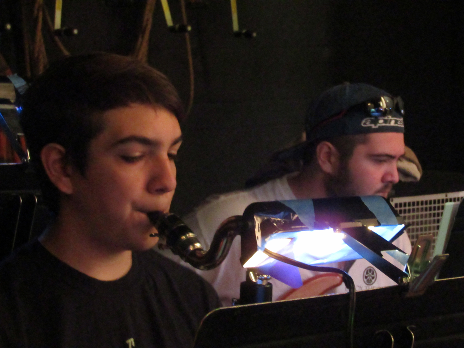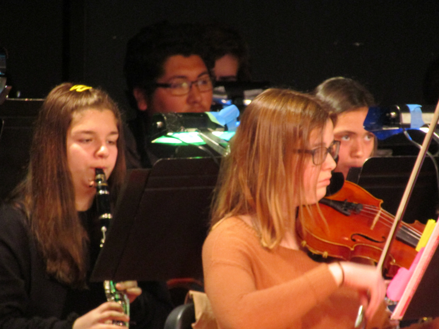 On stage, the musicians, organize their music and tune their instruments. under the baton of Ms. Julianna George, music teacher for both Martinez Middle School and Alhambra High.