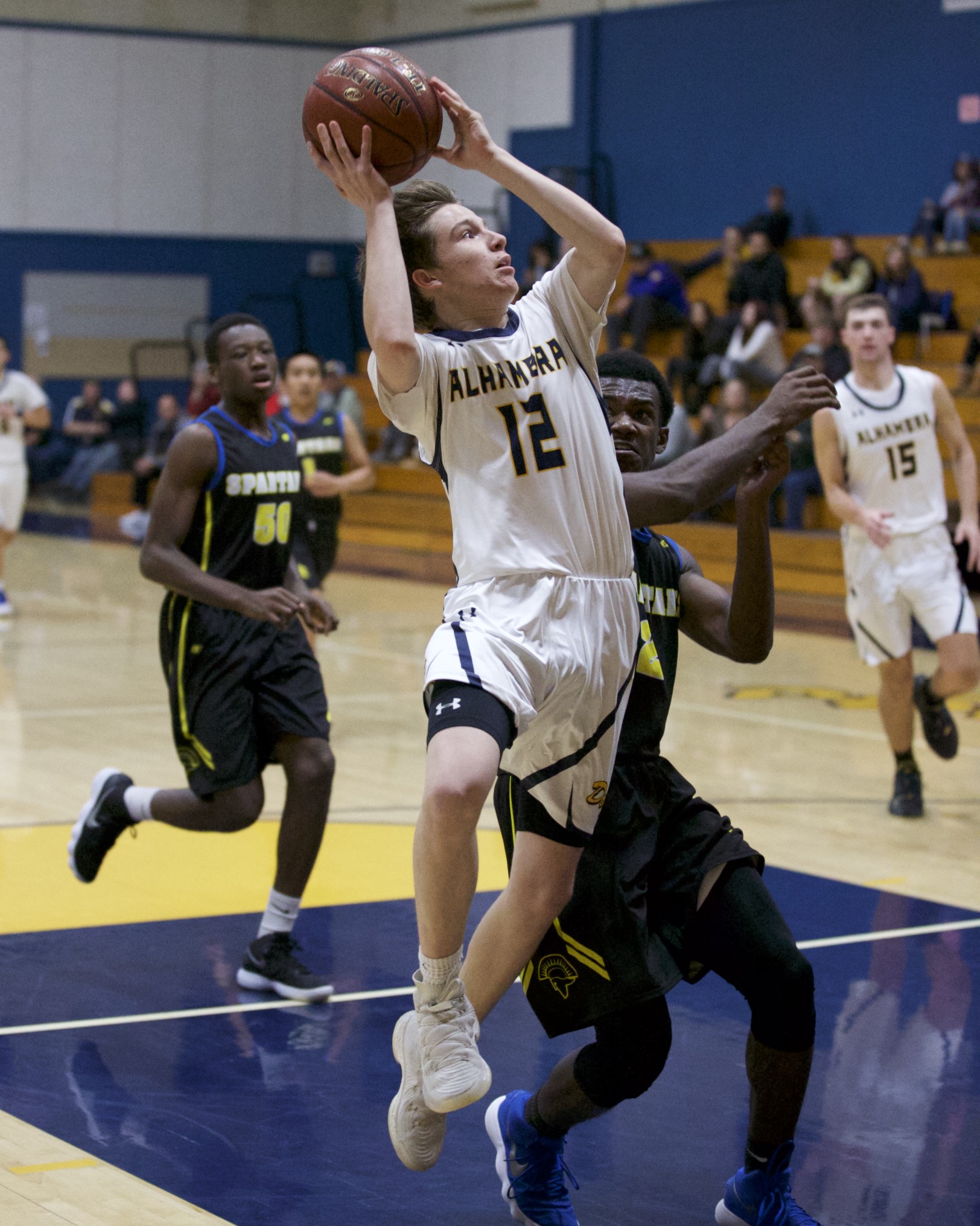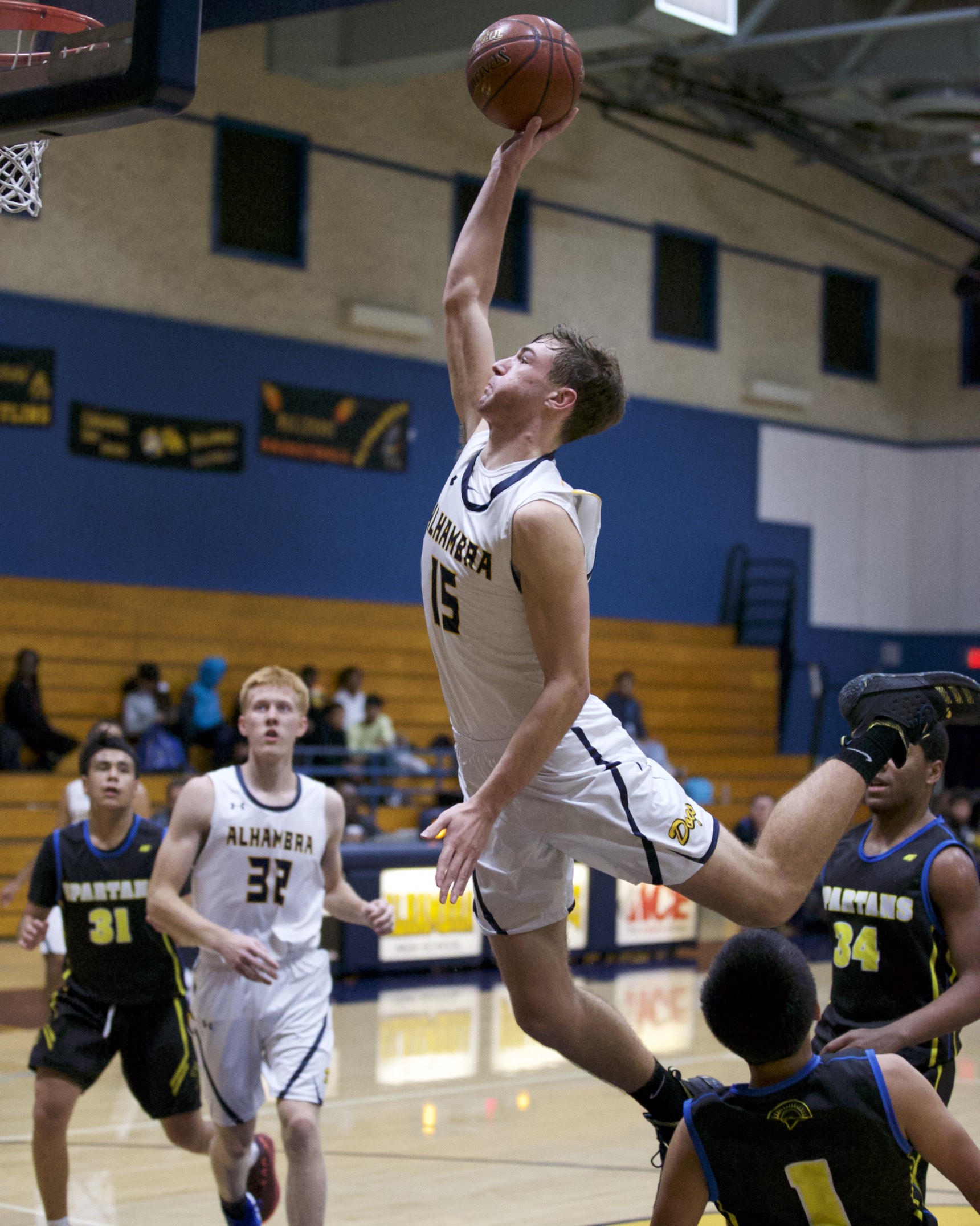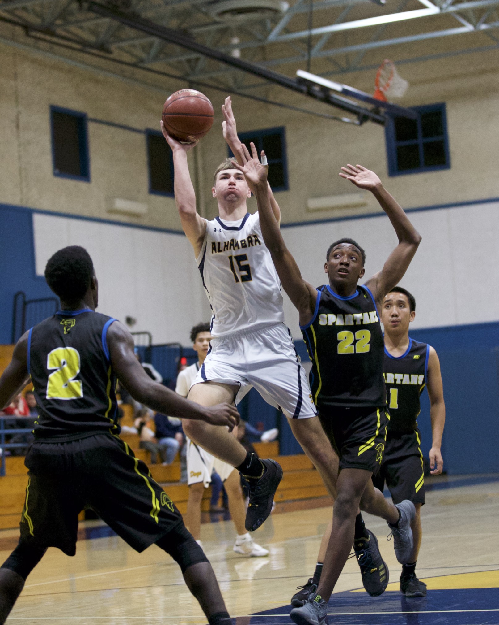 The Spartans came out firing in the third quarter, with Saiki hitting another three-pointer. But Wong answered with his third three-ball of the night. And, after Alhambra broke full-court pressure, Shepard nailed his third three with just seven seconds left on the clock, giving the Dogs a comfortable 46-30 lead heading into the final quarter.