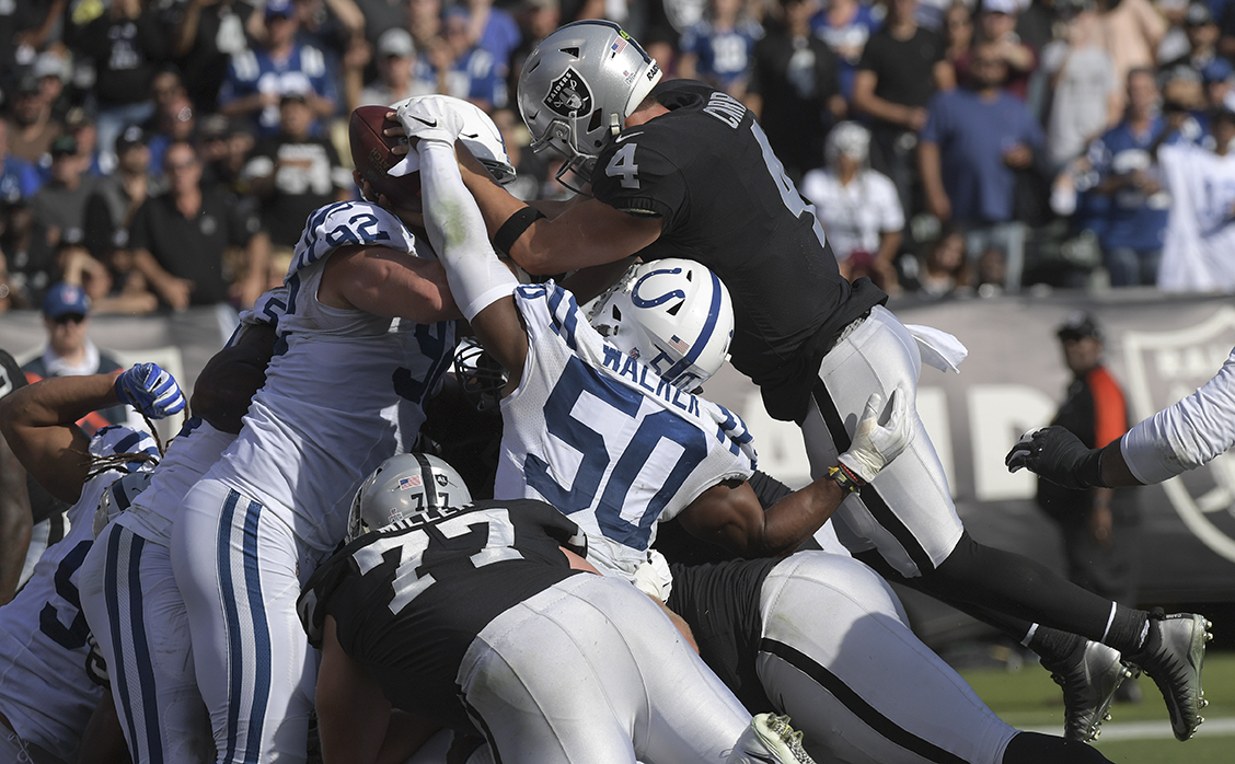 The Raiders (1-6) allowed Marlon Mack and the Colts to run for 222 yards and gave up three touchdown passes from Andrew Luck to his trio of tight ends.