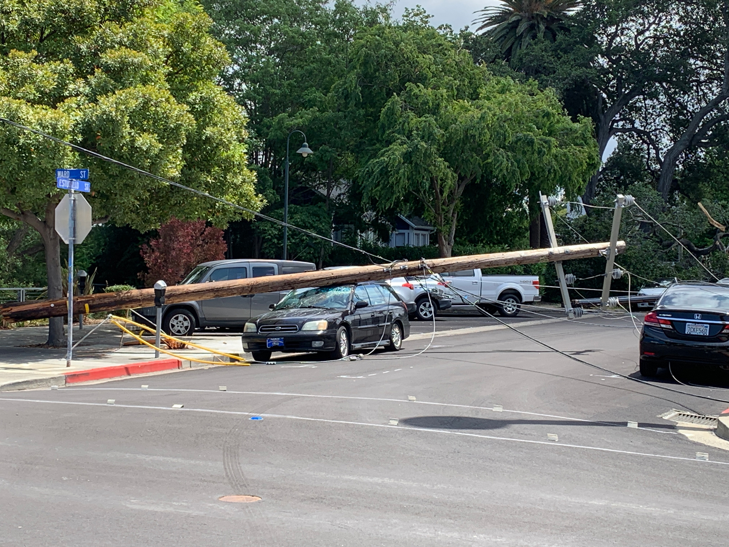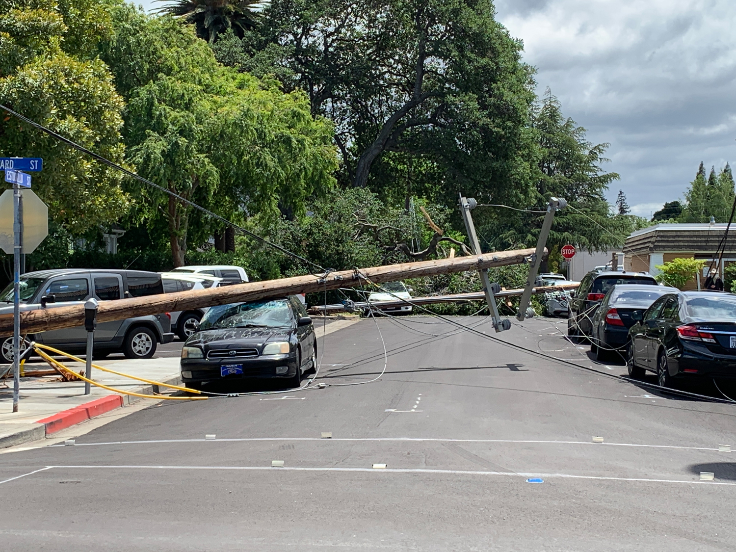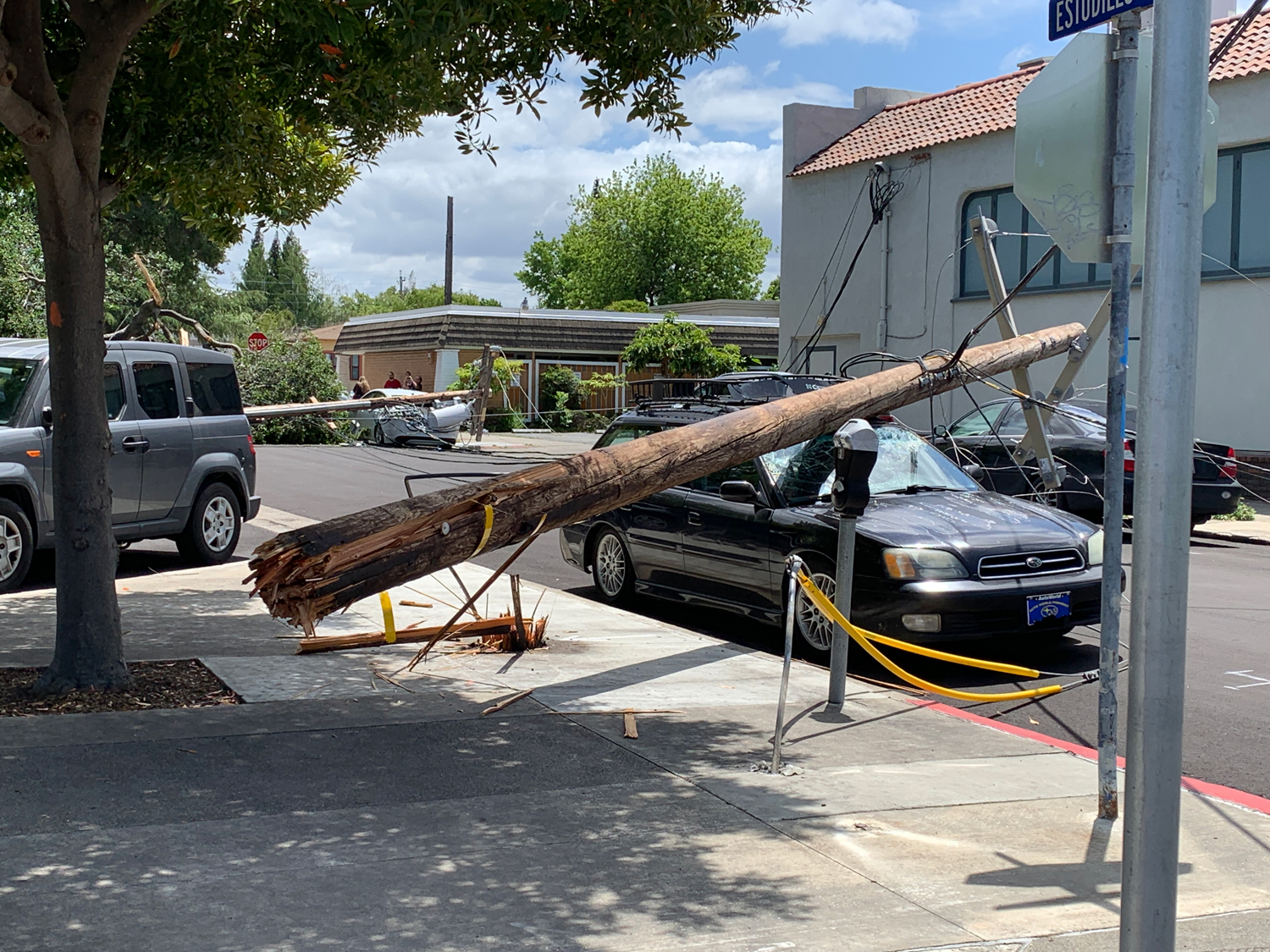 Around 1:00 p.m. in the 800 block of Estudillo St. in downtown Martinez, a partially fallen tree pulled down at least two utility poles, damaged at least four vehicles and caused power outages all over Martinez.