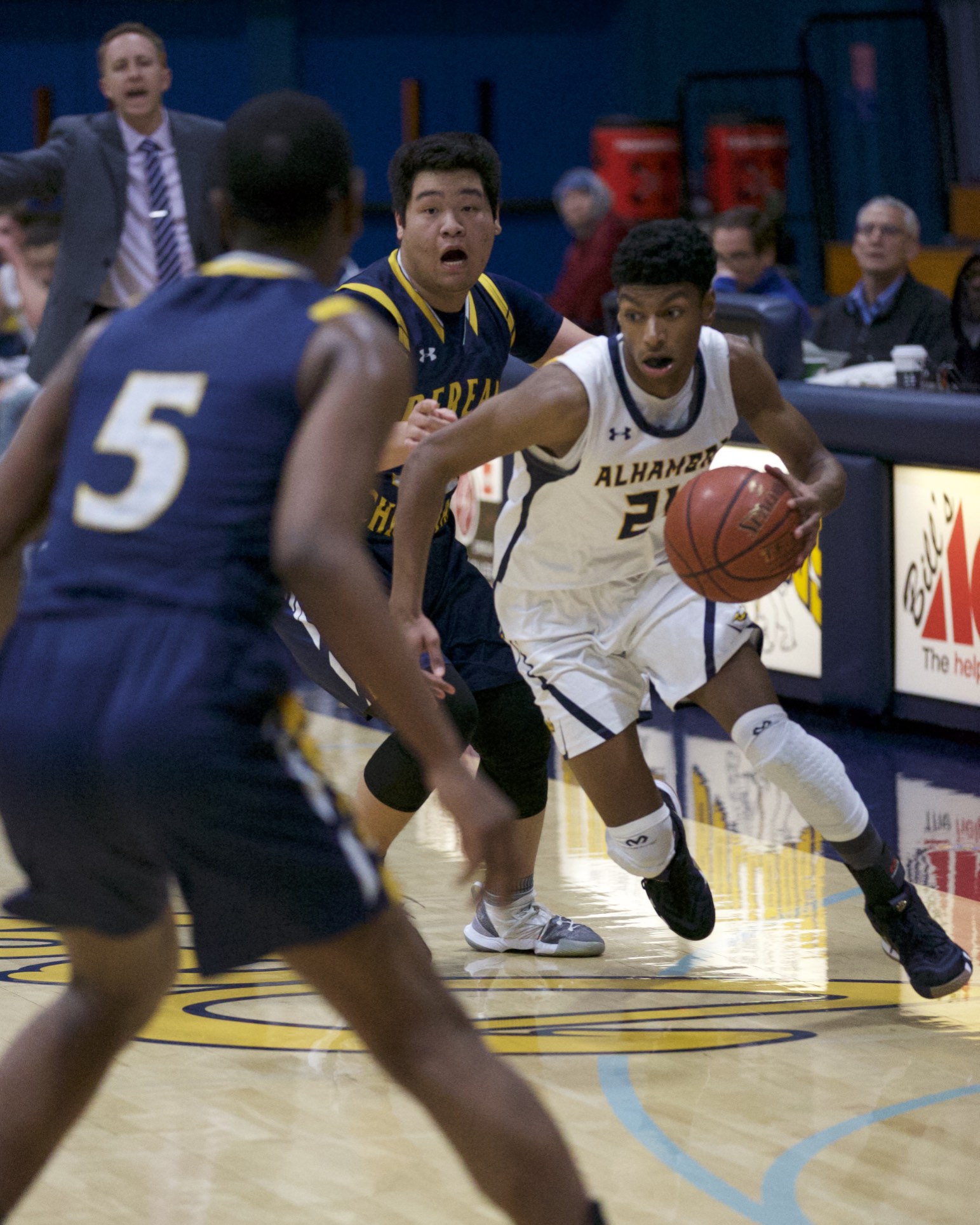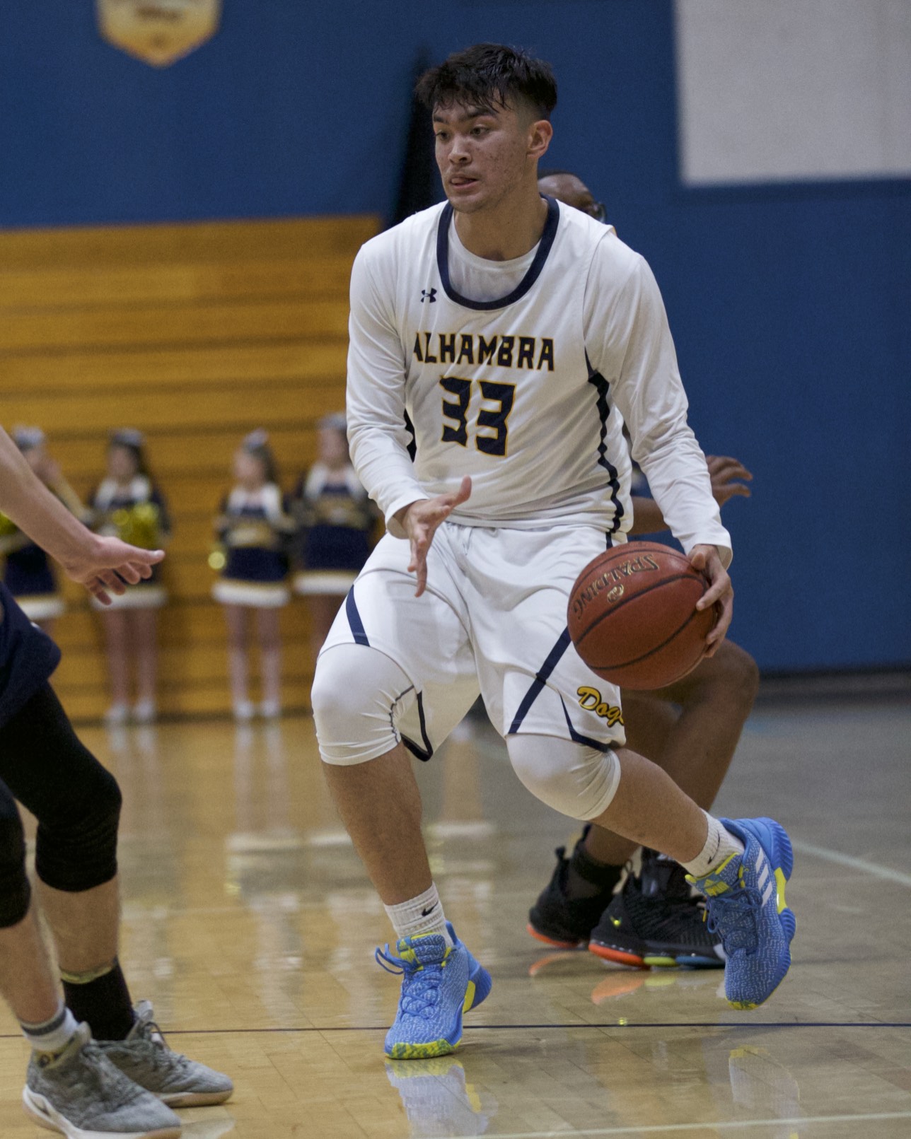 After a beautiful rendition of the National Anthem by referee L.G. Mills to kick off the first league game of the season, the Dogs (9-7 overall, 1-0 league) displayed great defensive intensity. They attacked ball screens, mixed up their defensive sets, hustled for loose balls, and generally made life uncomfortable for the Eagles (6-8 overall, 0-1 league). Alhambra led 19-12 at the quarter.