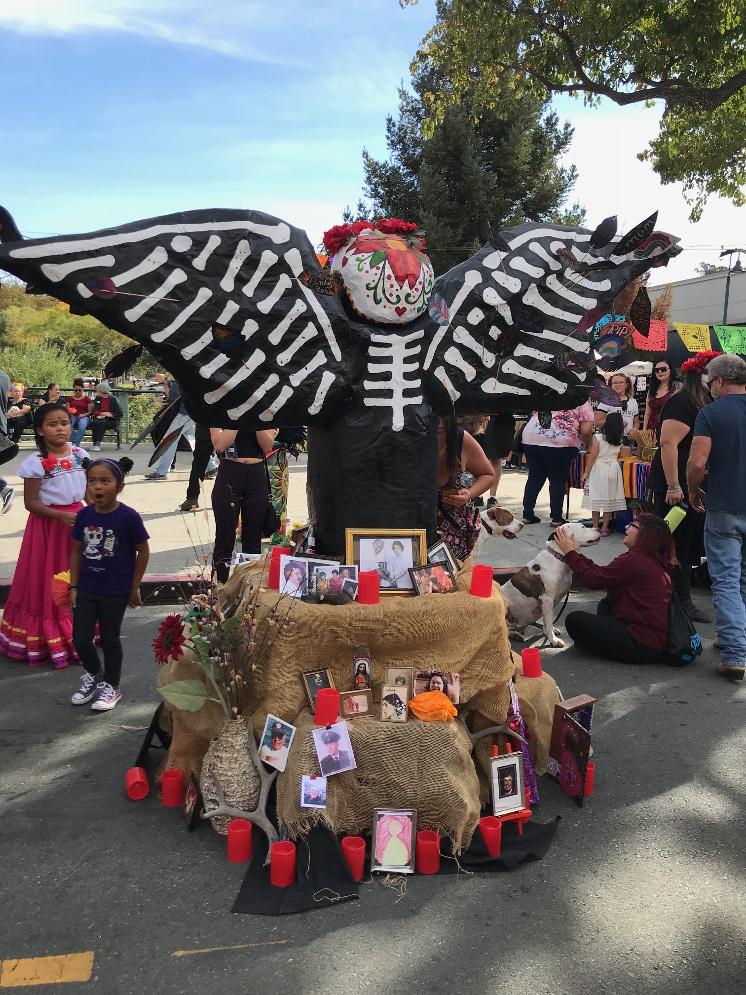Under spreading black wings, which gained paper feathers decorated in colored chalk by children, residents set up small remembrances of lost loved ones in a community altar.