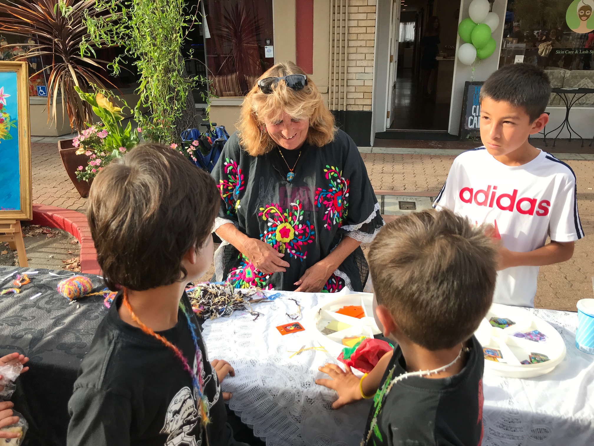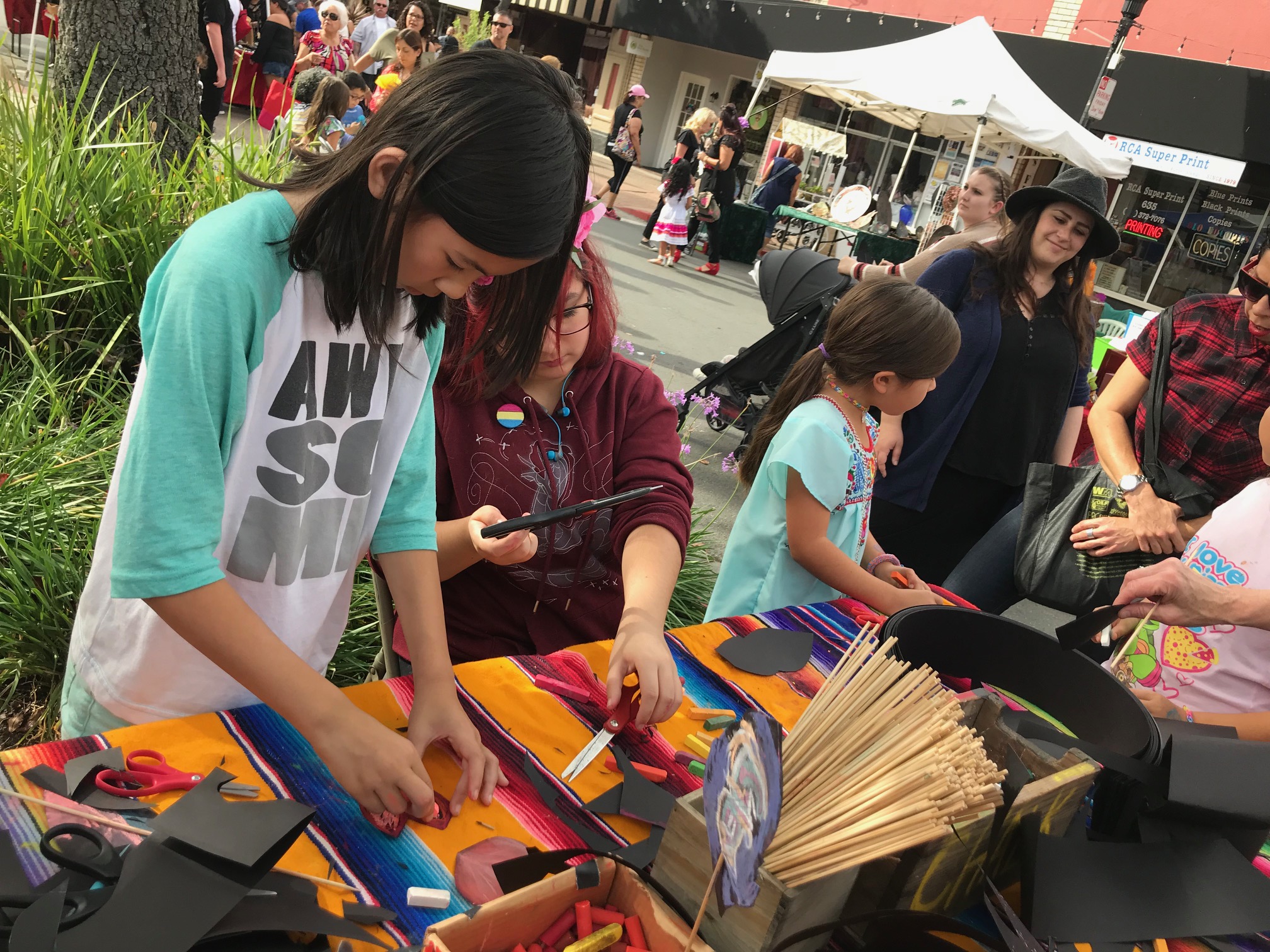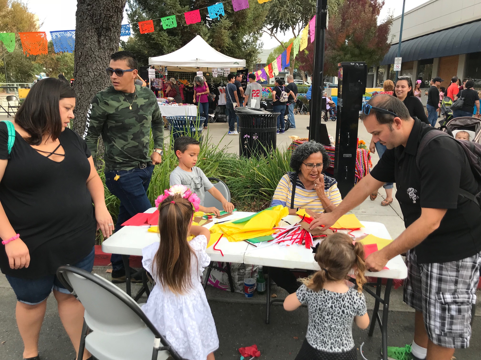 During Saturday’s event, several tables were set up so children as well as adults could try their hand turning wine corks into sugar skull images. Others used recycled materials to make pendants. Some, guided by Ana Gosney, learned to fold and open tissue paper to make colorful flowers.
