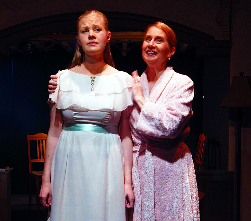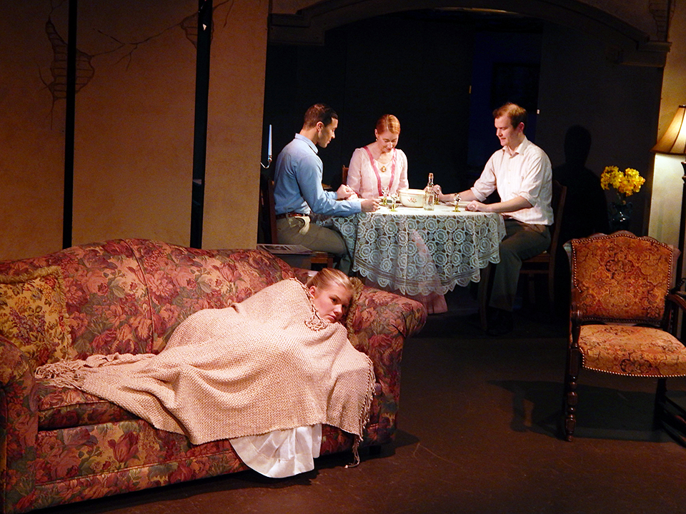 This play is a memory play with strong autobiographical elements, and the play that catapulted Williams from obscurity to fame. It consists of four characters: a histrionic, domineering mother, Amanda (Shay Oglesby-Smith), still indelibly immersed in her Southern proclivities and her fragile-as-glass daughter, Laura (Anna-Oglesby-Smith), imprisoned as a painfully shy young woman suffering a schizophrenic existence, nurtured in large part by an embarrassing physical disability. The principal male figure and the story’s narrator, is Amanda’s son, Tom (Carter Chastain), supporting the family by working in a shoe factory as a very low pay warehousemen, a job that he truly detests. The fourth and final addition to the story, is a former high school friend and compassionate coworker, Jim O’Connor (Ariel Sandino).