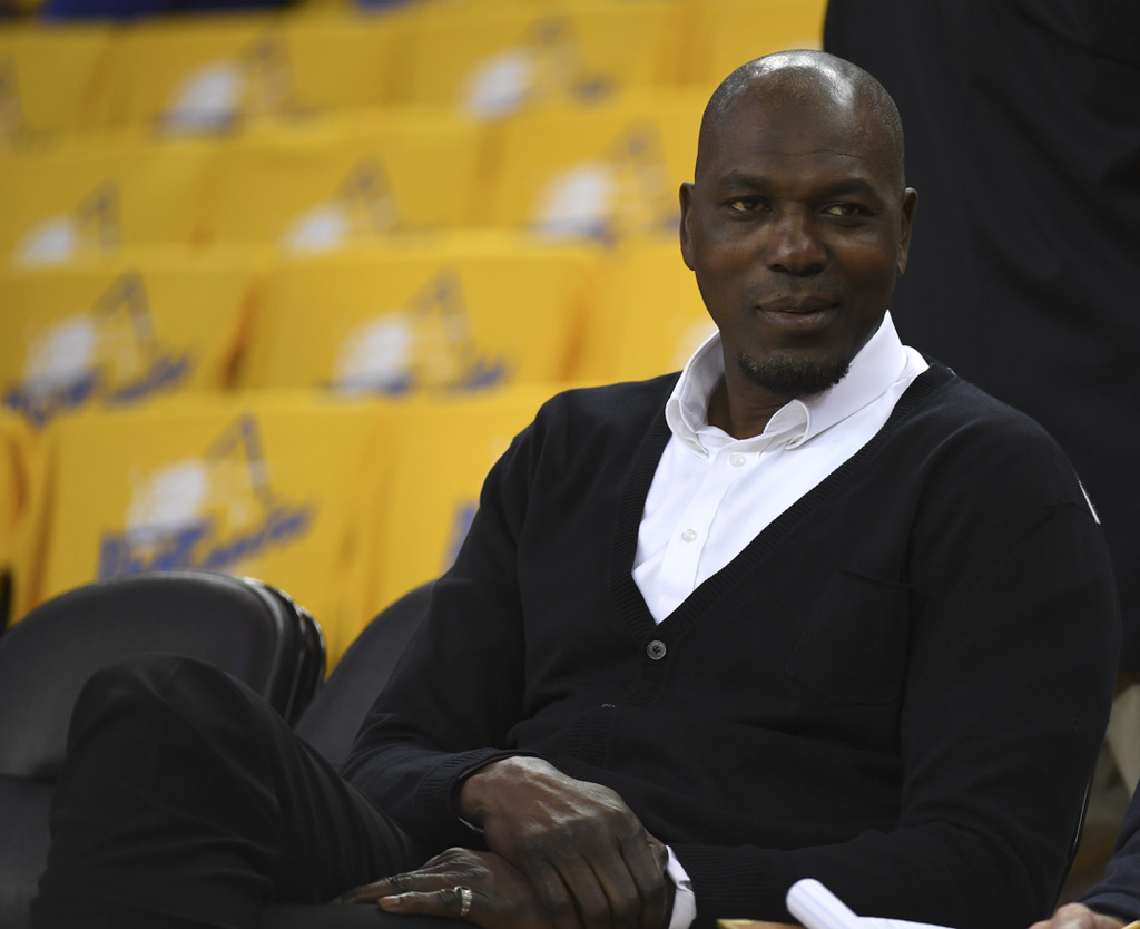 Golden State Warrios vs Houston Rockets Game five NBA Playoffs. Retired Rockets Center Hakeem Olajuwon Photos by Gerome Wright (Martinez News-Gazette)