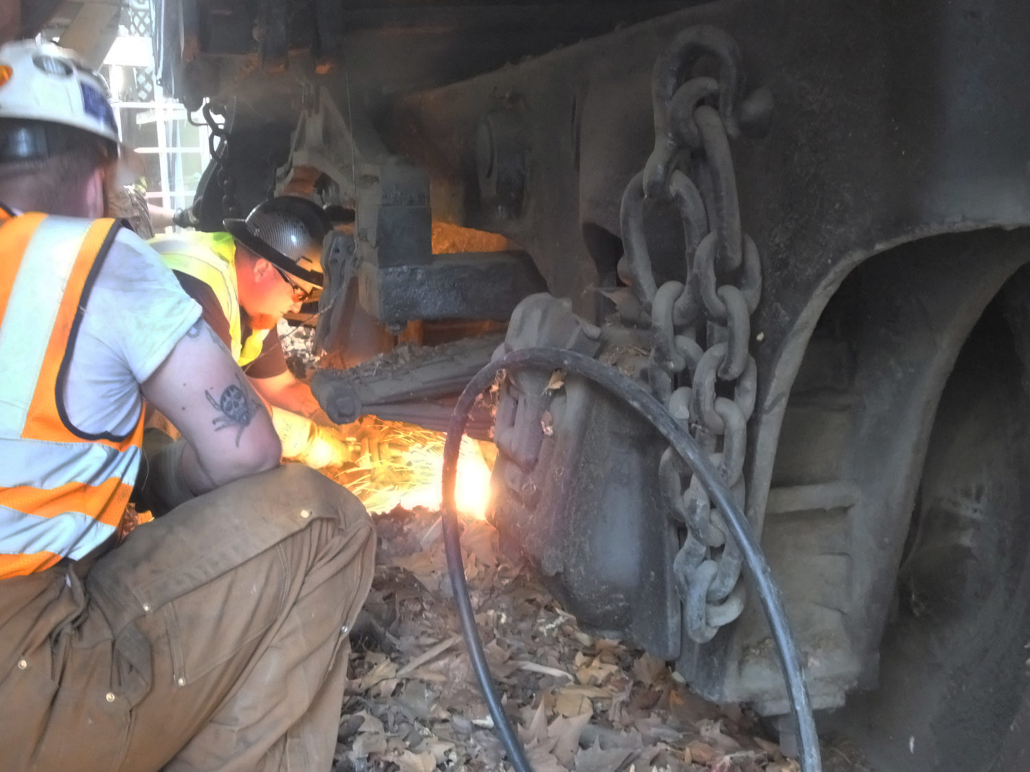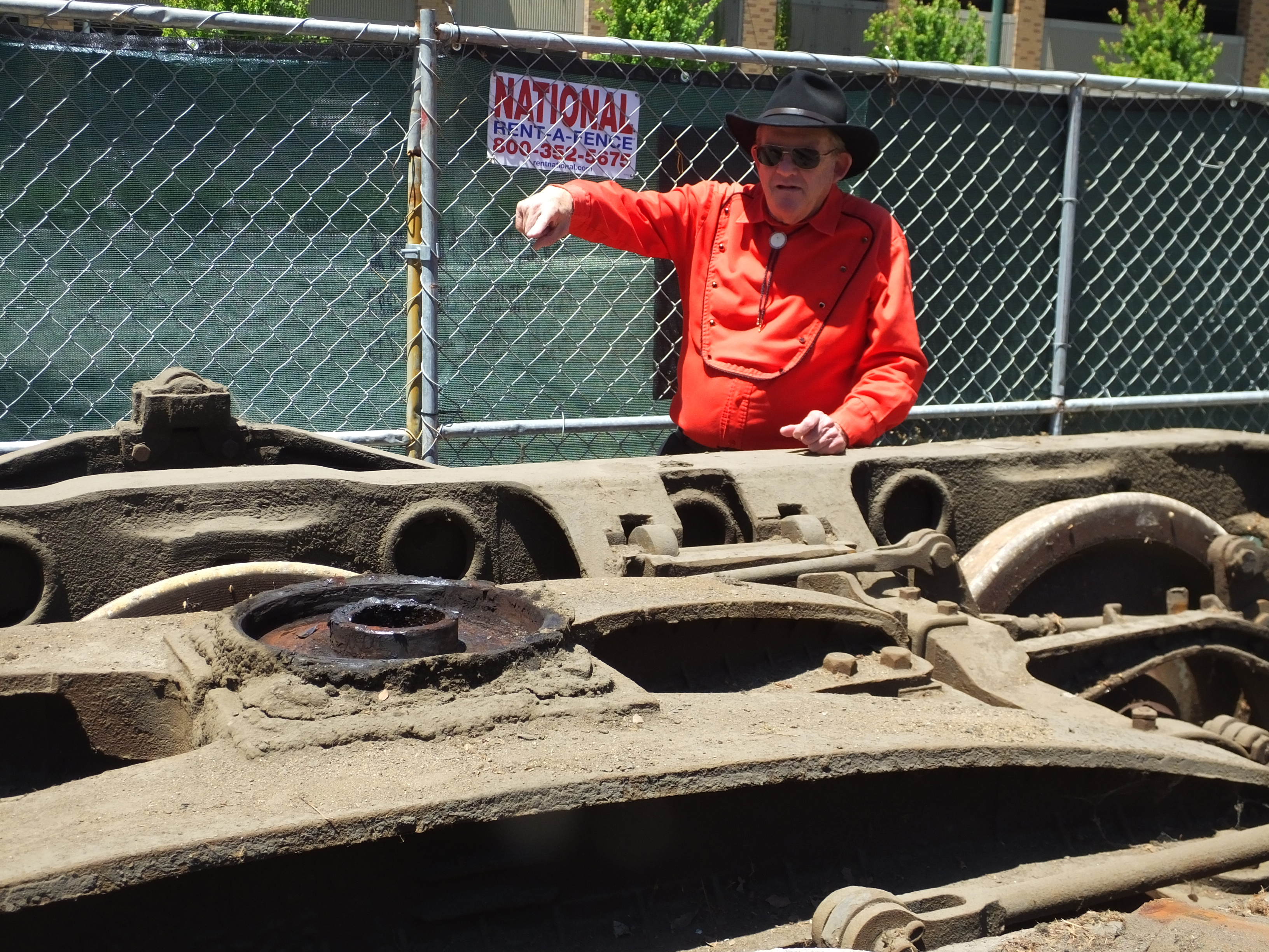 The rear end of the train car was on an independent dolly, he said. “I understand it was a steerable dolly to enable the vehicle to make sharp turns, because it was towing an exceptionally long load. Moving it in that manner, instead of placing it on a flat bed, meant that we didn’t have to take off all the components under the car.” Those included water tanks, battery boxes and the brakes; air tank.