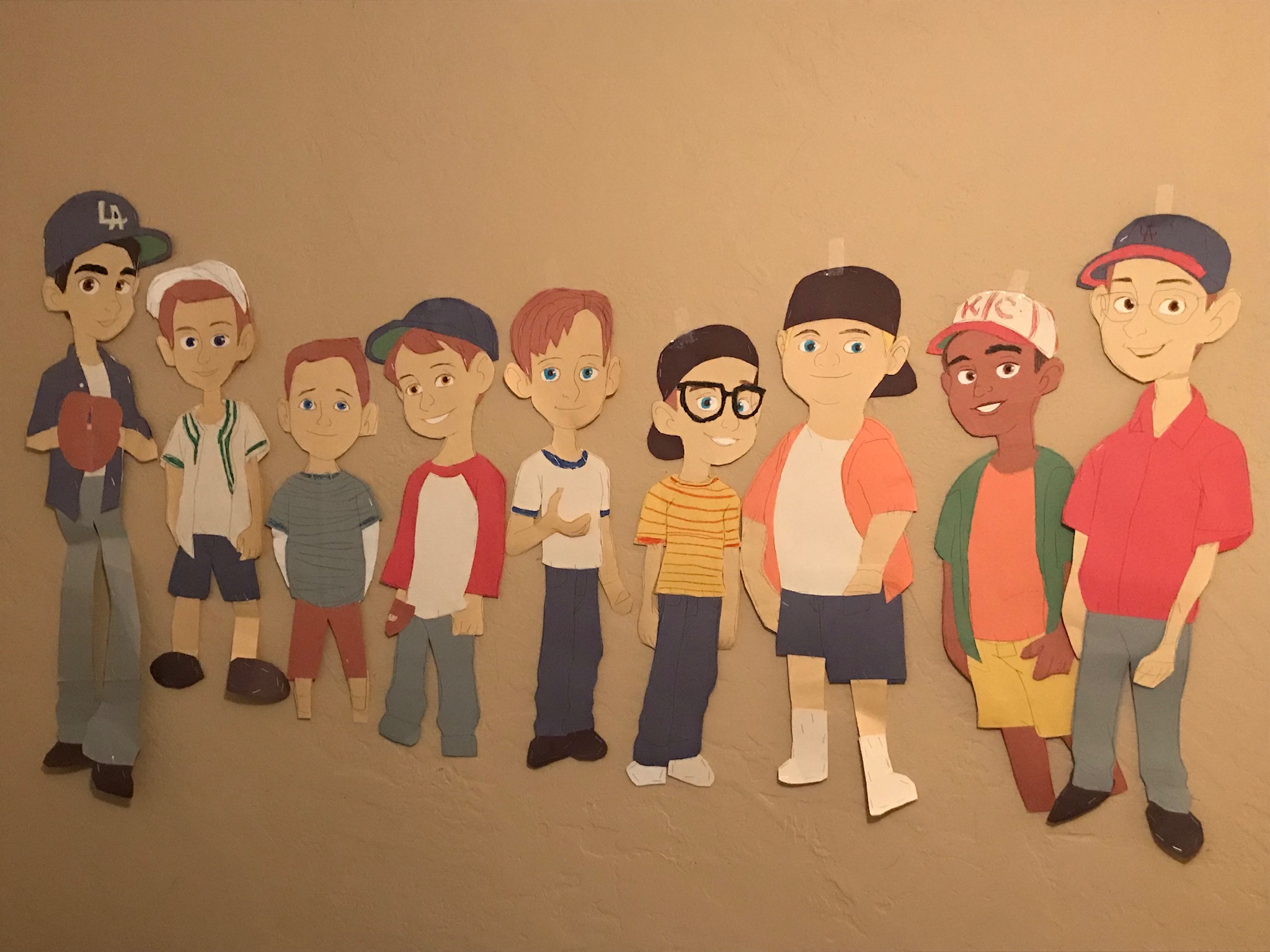 The cast of “The Sandlot,” interpreted as cartoon characters, fills another wall.