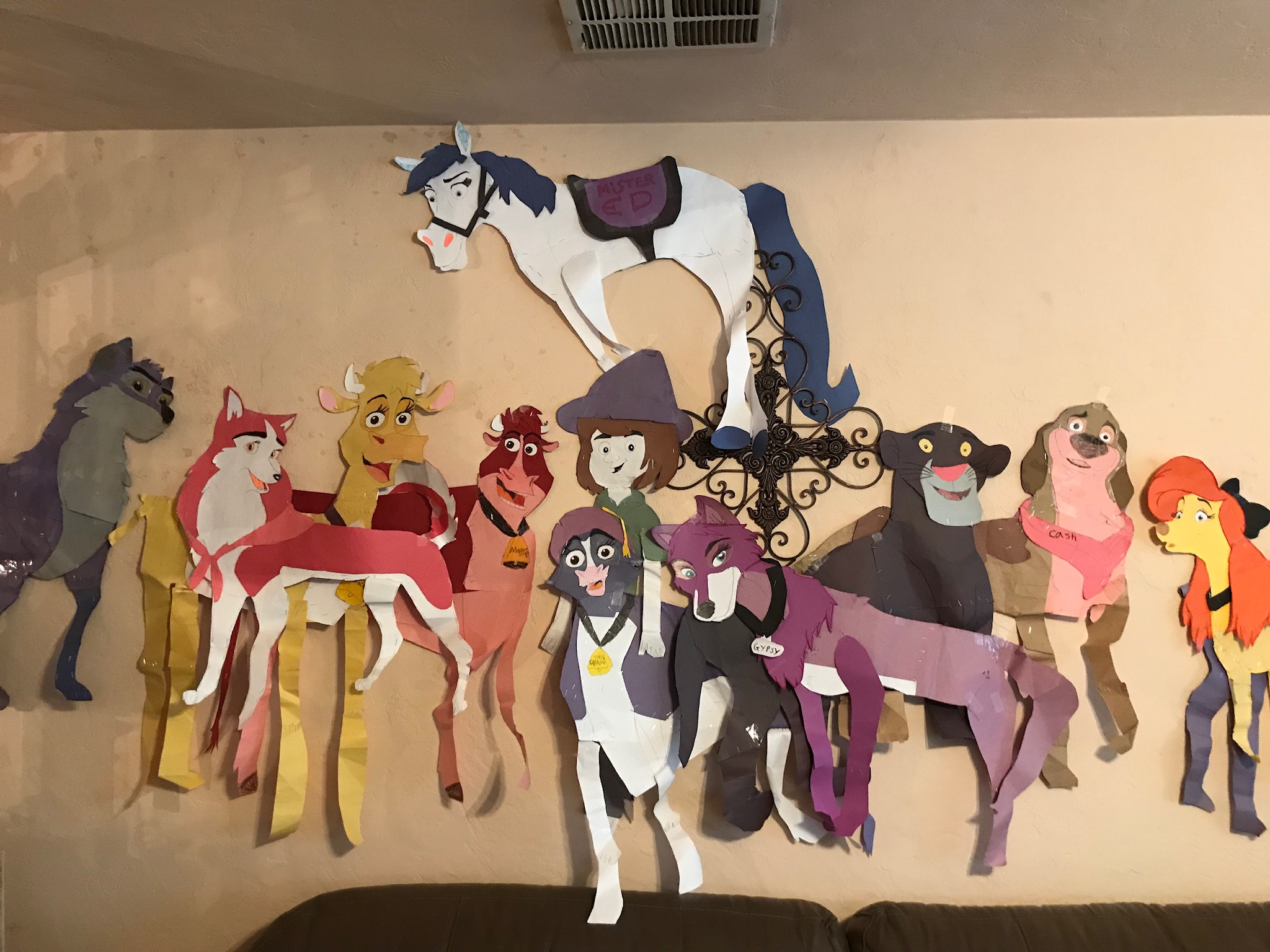 Peter Pan protects Wendy and her brothers from the deadly Captain Hook. The talking horse, Mr. Ed, holds court among cartoon characters on another wall.
