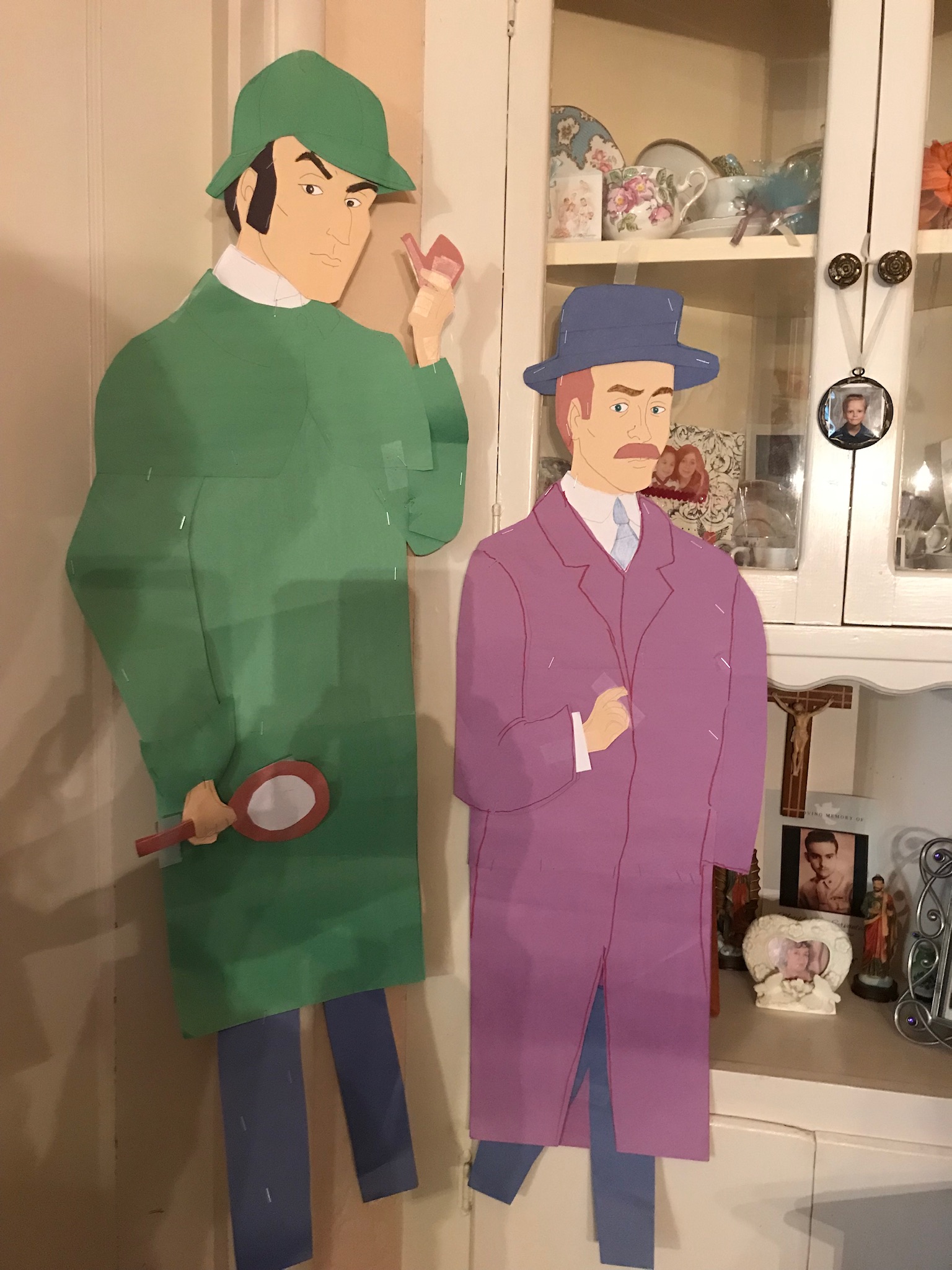 Sherlock Holmes and Dr. John Watson, standing near a cabinet, take a break from an investigation.