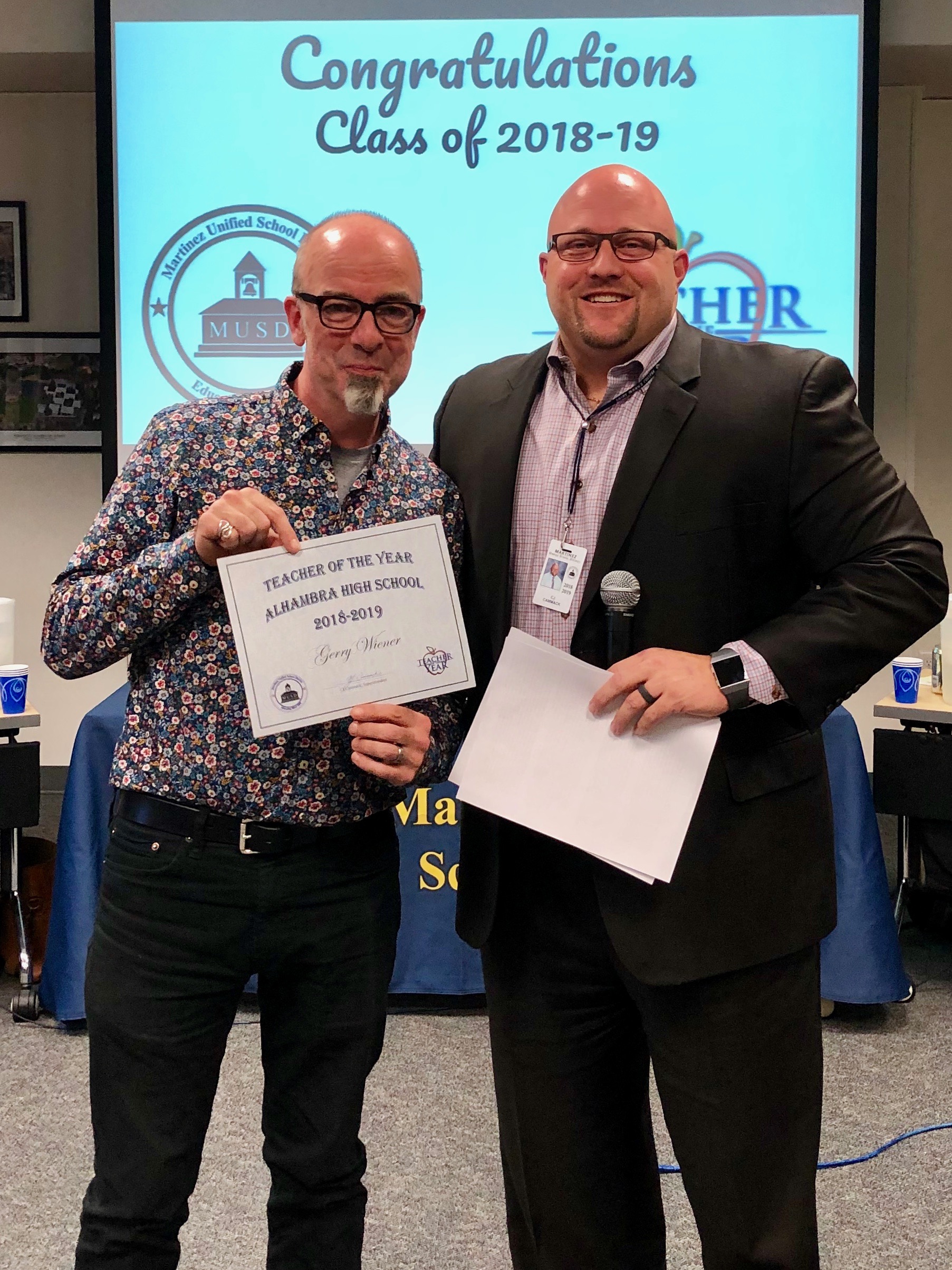 Gerry Wiener is Alhambra High School’s very talented drama teacher. He has taught beginning and advanced levels of drama as well as musical theater, choir, and English with an emphasis on arts integration for over 25 years in Martinez. In Gerry’s classes, students work collaboratively in a positive and creative setting to find their voices and explore myriad dramatic and musical techniques, building confidence that will serve them in all aspects of life. Gerry is a strong educator dedicated to student learning, growth in the arts and the overall development of students as productive, caring, and contributing members of our community. The energy is his classes is contagious and I have been impressed with how he integrates life skills and positive choices in his work. Whether it is observing him in the classroom or around campus and school activities, Gerry is always looking for ways to connect and make each situation a learning opportunity. We are so honored to celebrate, Mr. Gerry Wiener as the Alhambra High School Teacher of the Year!