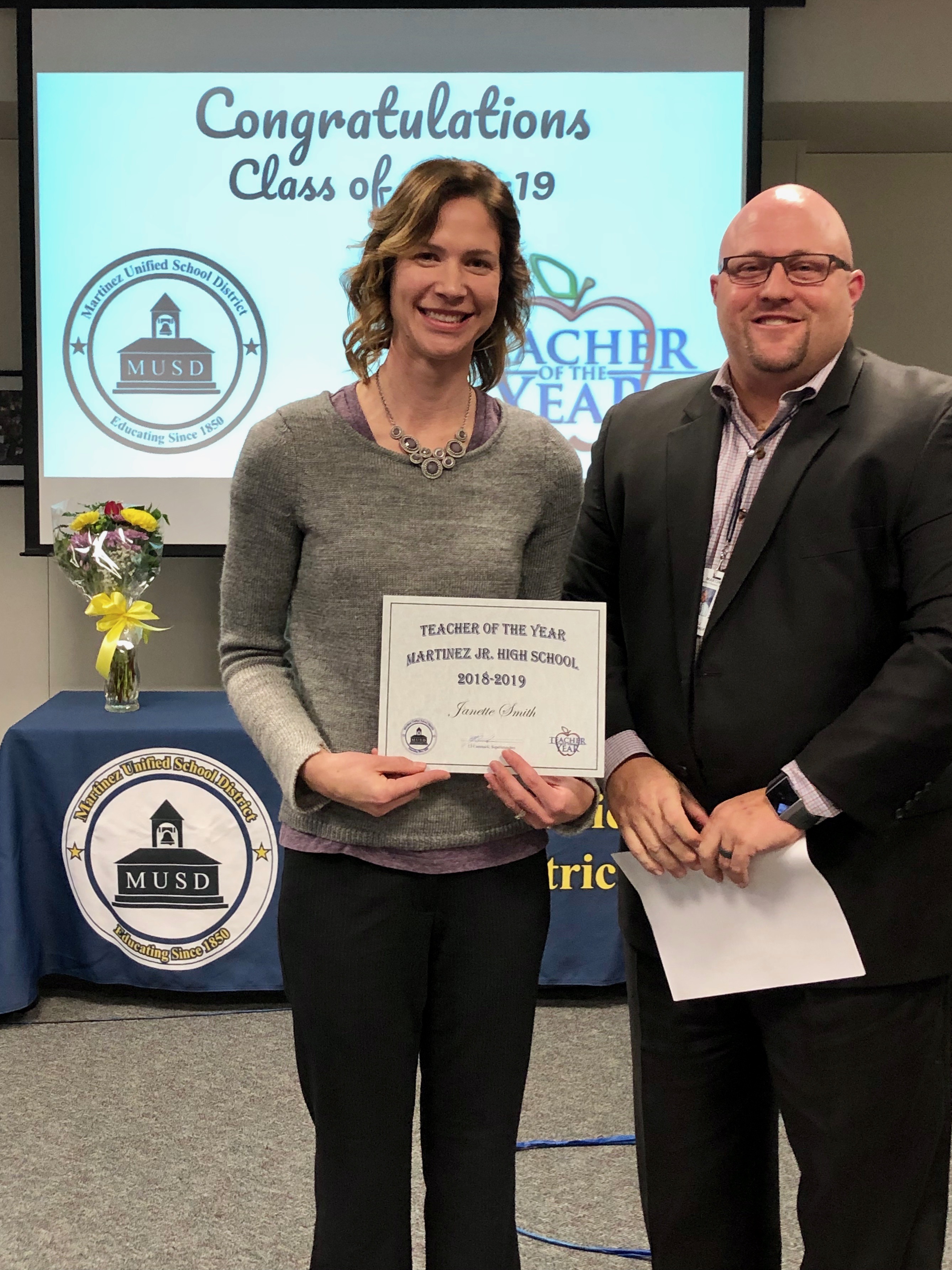 Janette Smith Martinez Junior High School is fortunate to honor our esteemed colleague, math teacher Janette Smith, as our Teacher of the Year. In the classroom, Janette works tirelessly to instill a growth mindset in her students. As a result of her efforts, Janette’s students walk into math with a “can do’ attitude. Her exceptional teaching is evident in how she fosters trust and community within her classroom; how her students want to perform and take ownership of both their struggles and successes, and how she proactively reaches out to parents when she has concern for a student. Janette is deliberate in all that she does and her innovative, dynamic teaching strategies are clear evidence of how hard she works to ensure that all students can access her math curriculum. In collaboration with fellow teacher Laura Greenblatt, Janette has begun to apply her skills towards improving school climate through the development of a Homeroom Think Tank program, which gives students a platform to voice their suggestions and ideas about how to make MJHS a better place to be, while equally bridging the relationship between students and staff. We both congratulate and thank Janette for her dedication to our students.