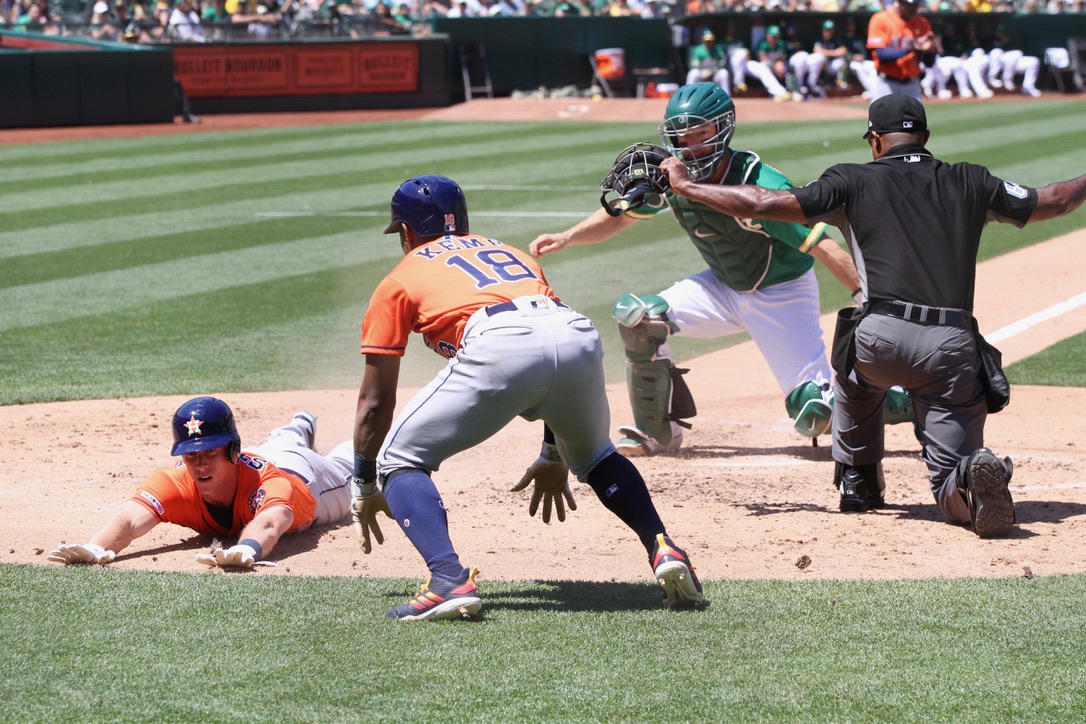 The Astros got run-scoring singles from Michael Brantley and Yuli Gurriel against Lou Trivino in the top of the 12th inning Sunday to send the Athletics to their fifth straight defeat with a 6-4 loss and sweep a three-game series before a crowd of 23,144 at the Coliseum.