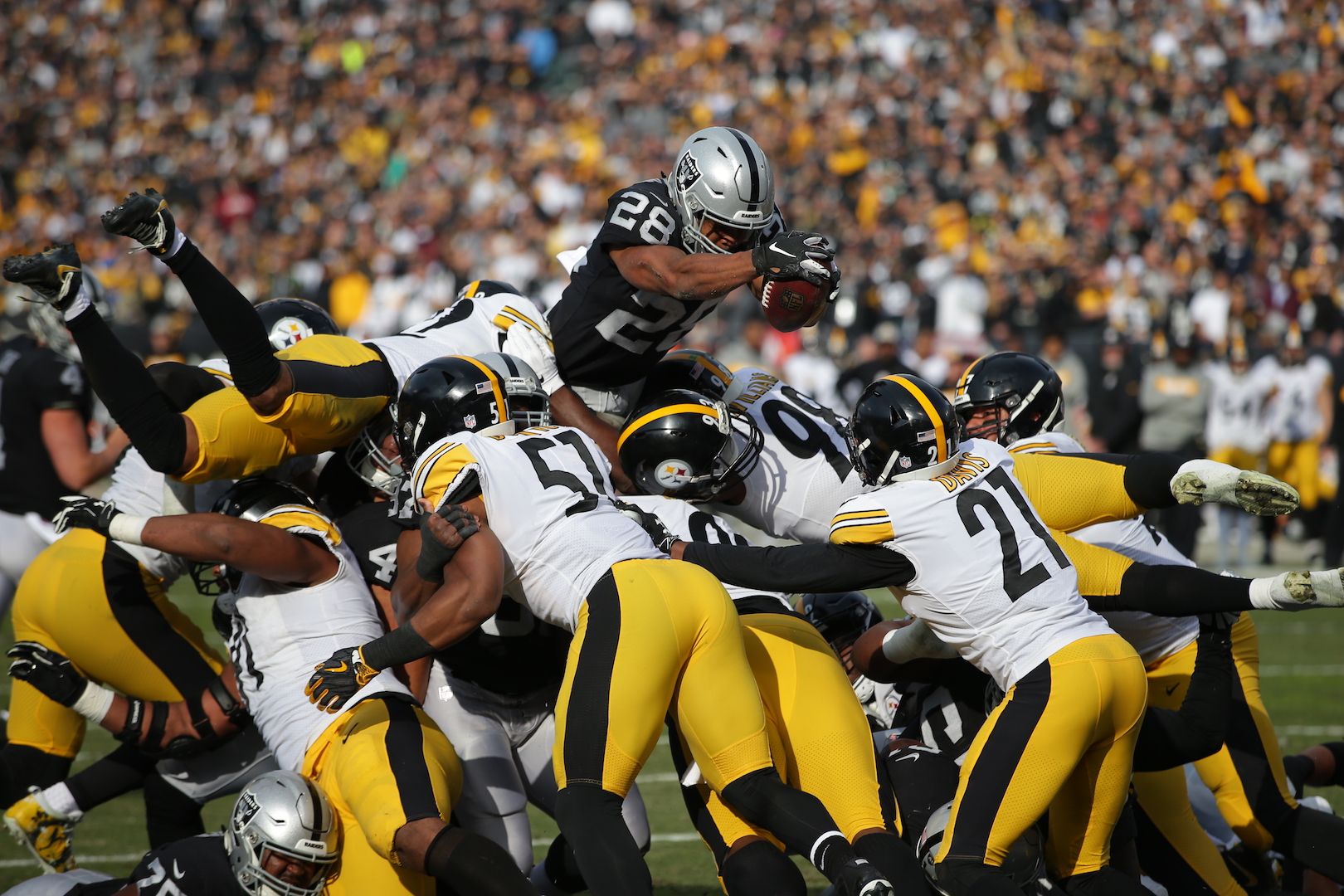 Oakland Raiders vs Pittsburgh Steelers RB #28 Doug Martin Over the top Photos by Tod Fierner ( Martinez News-Gazette )