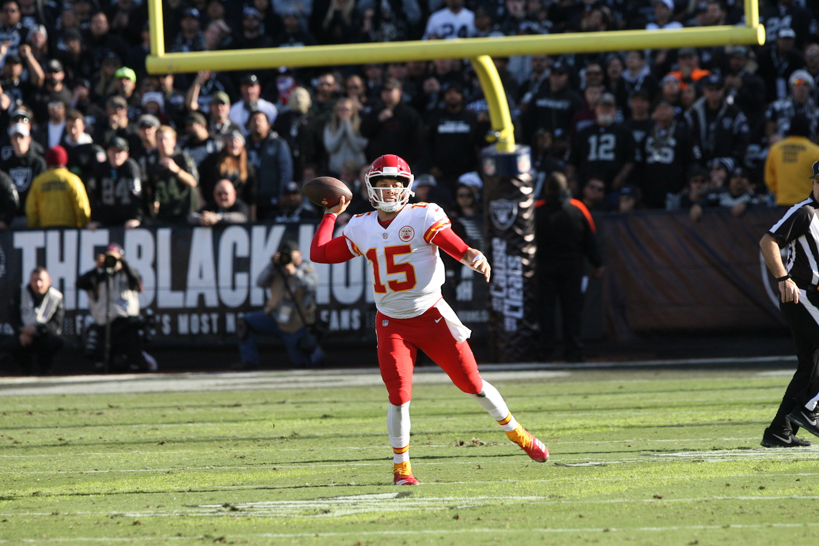 Patrick Mahomes threw four touchdown passes Sunday to join Peyton Manning and Tom Brady as the only QBs to reach the 40 TD mark through 12 games. The Kansas City Chiefs won their first game since releasing star running back Kareem Hunt, 40-33 over the Oakland Raiders.