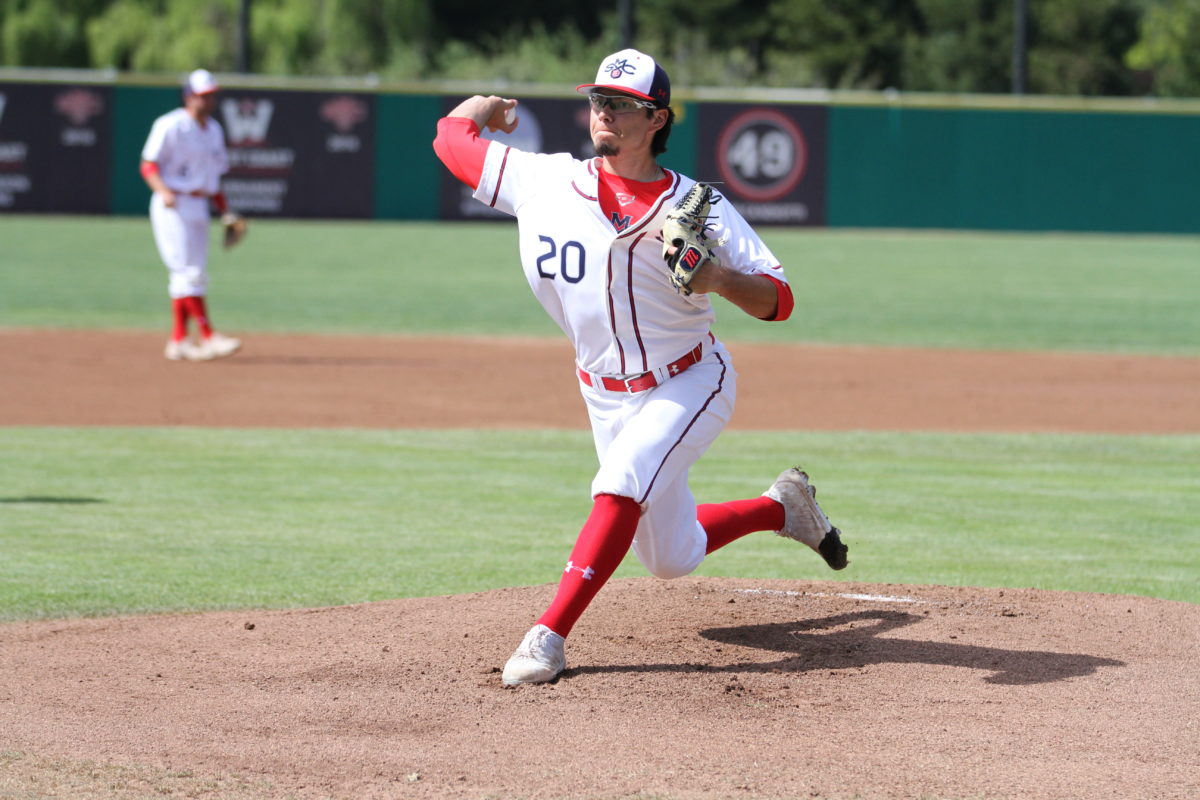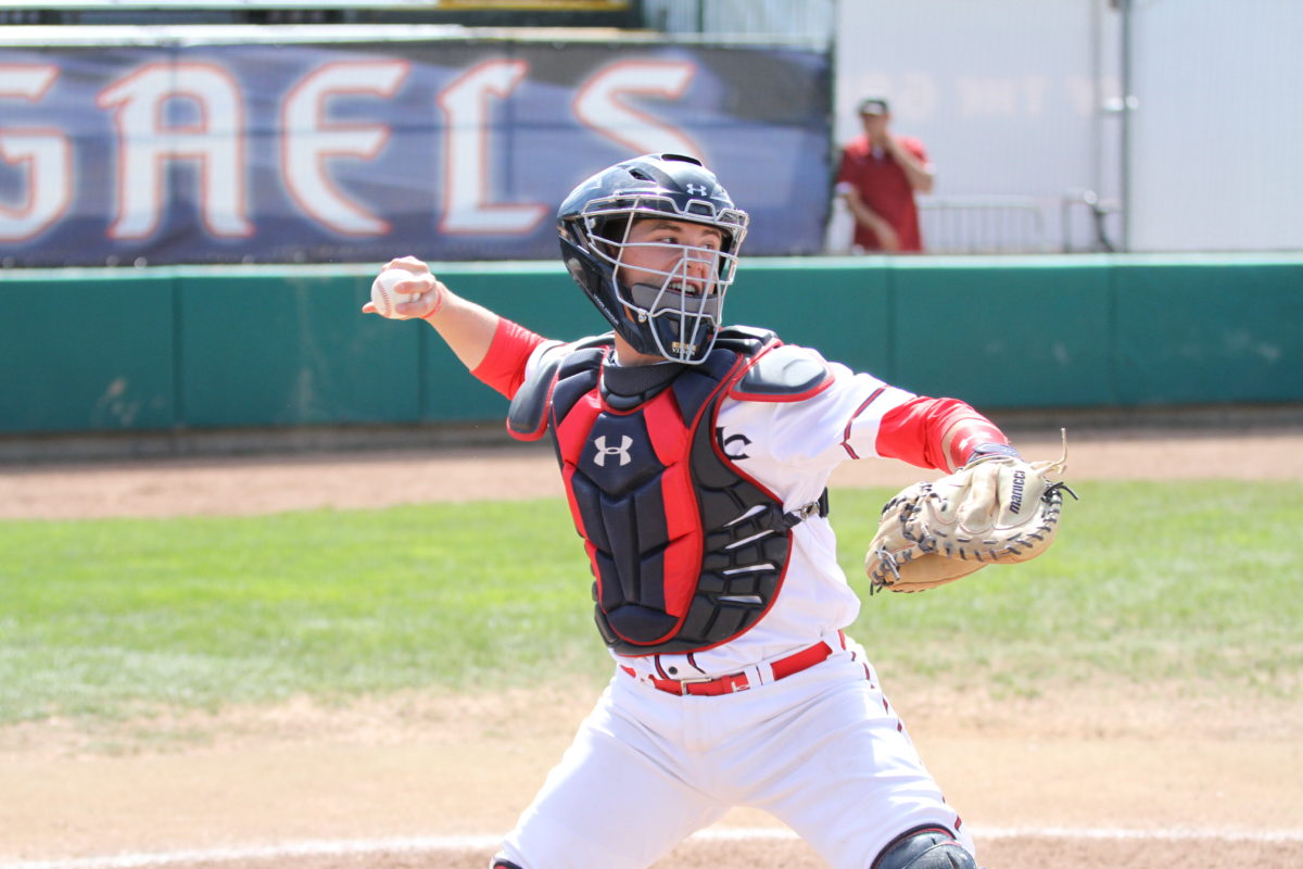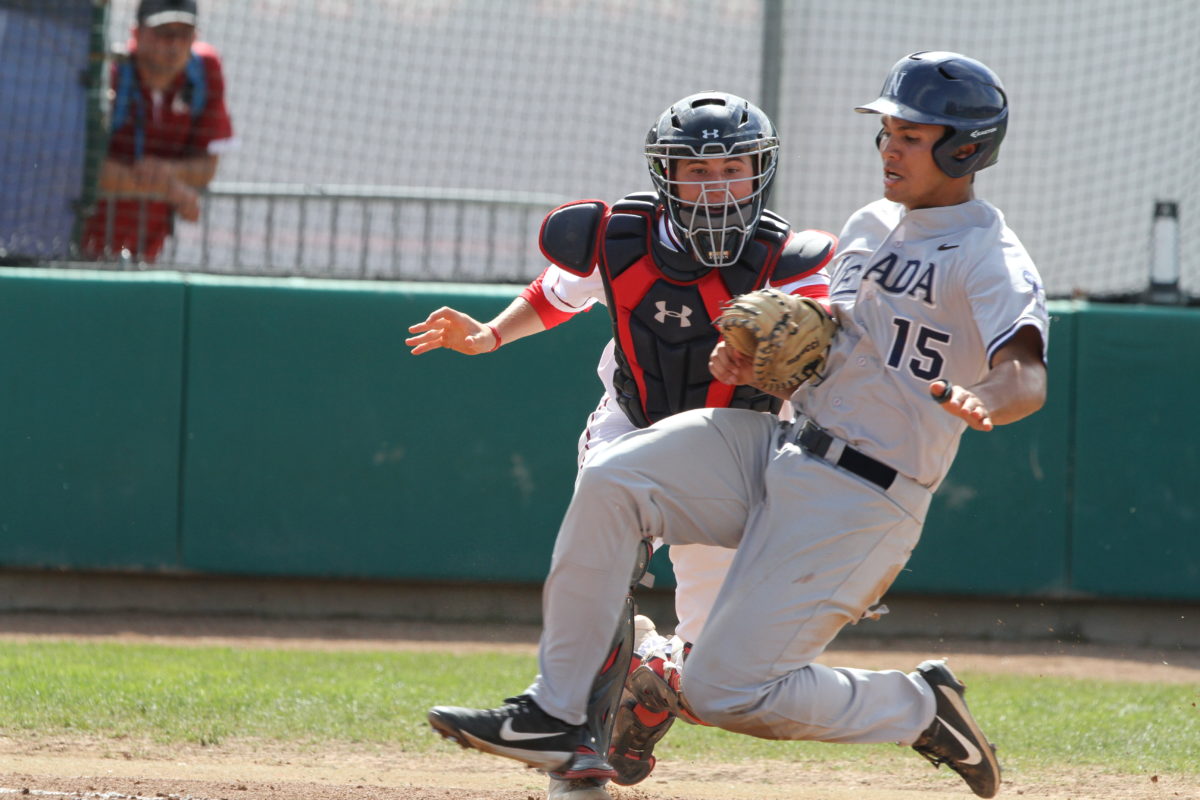 #21 JC Santini tags runner out at the plate. #20 P. Carlos Lomeli Throws four shut out innings.